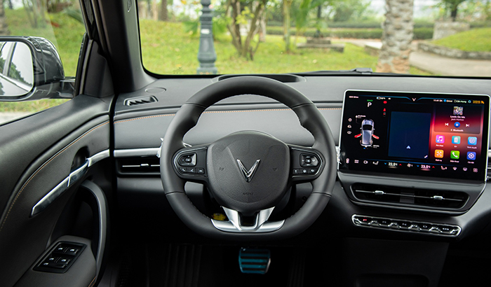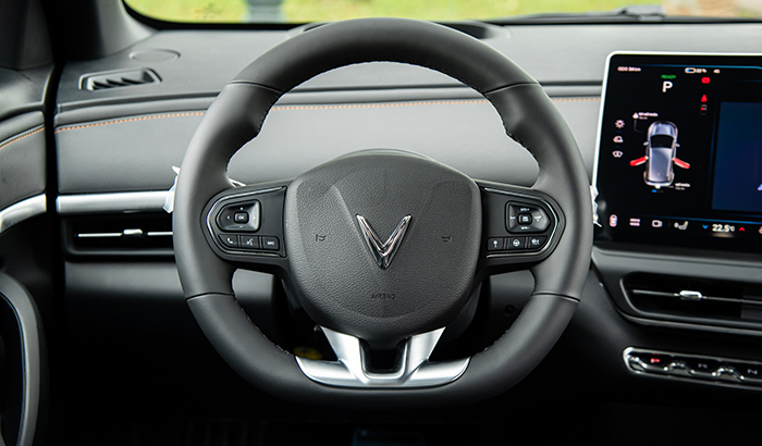 Vô-lăng 3 chấu được bọc da, thiết kế vô lăng của VF6 dạng vát đáy, trung tâm xe là màn hình kích thước lớn vừa để hiển thị thông tin vận hành.